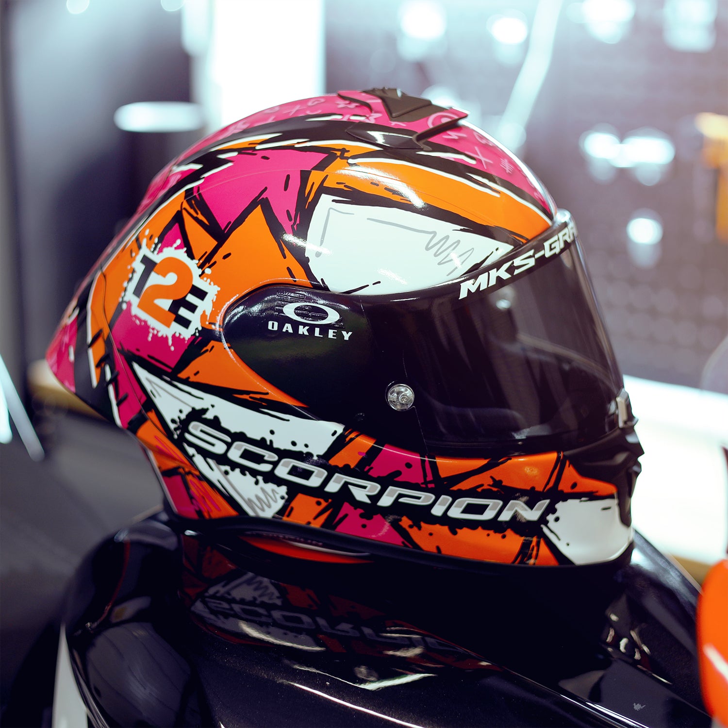 In order for us to create a full-custom design for your helmet, we would need to make templates first. Do keep in mind that we cannot accept every helmet, as some helmets are just too round (how odd that might sound) to accept graphics.